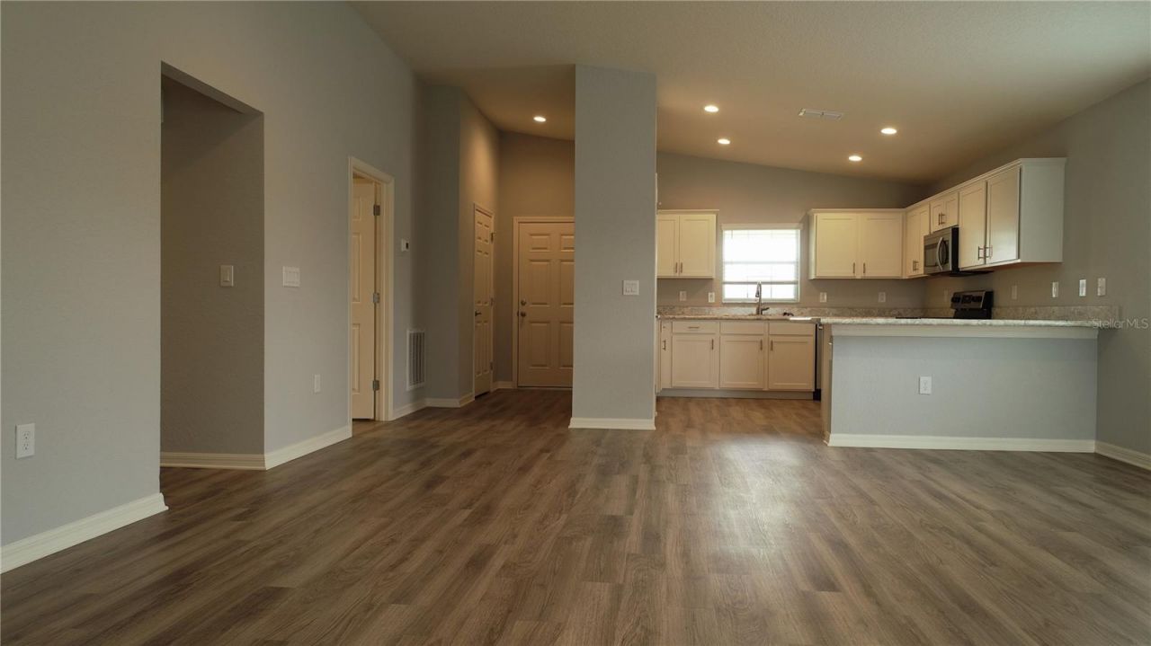3/2 in Townepark Estates features an open layout with volume ceilings, beautiful kitchen, and cool interior features. This home has built-in pest control, an irrigation system, and small rear screened patio. Lawn care included with rent.