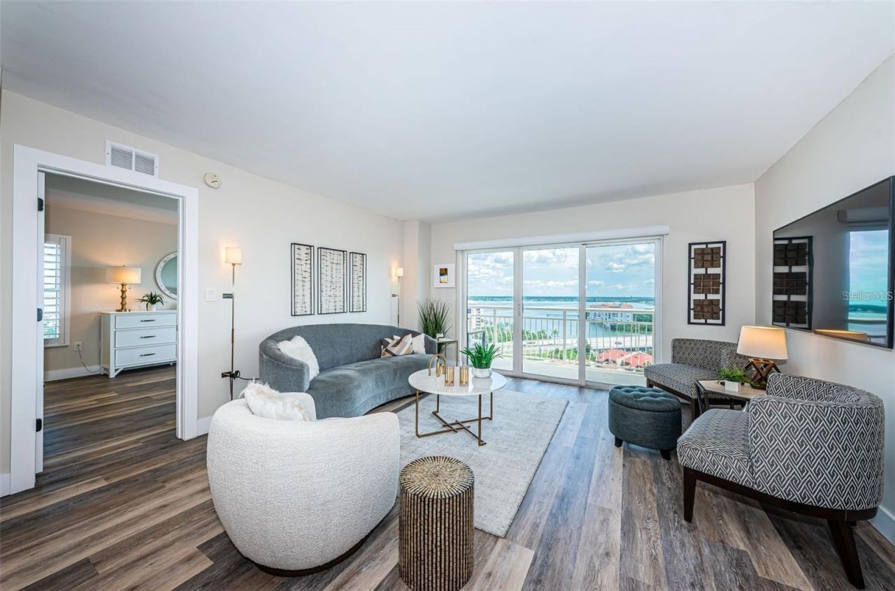 City or sunset view? With this home you do not need to decide because you have both right in front of you. This light-filled, custom designed, premier corner unit, has been completely rehabbed. Some of the details include new electric, new plumbing, luxury vinyl hardwood flooring throughout, custom cabinetry including bar area with beverage cooler, quartz countertops, new 2 1/2 ton AC in 2024, custom designed closets, plantation shutters in bedroom, solar shade in the living room and hurricane shutters on on all 3 sliders on balcony plus so much more! Enjoy water views from you expansive 30 ft balcony that has access from both bedrooms and living room. This condo is located in the prime location of Point Brittany, a 55+ community, which is on the Pinellas Bayway. St Pete Beach is 2 miles away and vibrant downtown St Pete is less than 10 minutes! The amenities are endless as there are 4 heated swimming pools, hot tub, clay tennis courts, shuffle board, a walking path through out the community along the sea wall, clubhouse with an amazing fitness room along with weekly exercise and yoga classes, pool tables, card rooms, boat docks, kayak/paddle board storage and launch, fishing pier and more. So many social events that no one should be without anything to do. To top it off there's The Country Store on the property to save those trips to the grocery store. There is also extra storage and a garage space. This is an annual rental.