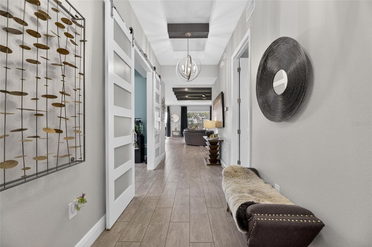 Located at 7317 Hourglass Drive, this masterfully designed solar-powered residence is situated within the highly sought-after master-planned community of Waterset in Apollo Beach. From the moment you enter, high ceilings accented by sophisticated beams set a grand tone for this 4-bedroom, 3-full bathroom home. The heart of the residence is an open-concept kitchen featuring premium appliances, a sleek quartz waterfall island, and a dedicated beverage fridge for effortless entertaining. The split floor plan ensures maximum privacy, offering a front guest suite with a dedicated hallway bath and two additional bedrooms that share a contemporary bathroom with a walk-in shower.The living areas are designed for the ultimate Florida lifestyle, utilizing double sliding doors that seamlessly connect the interior to a screened-in lanai. Here, you can enjoy tranquil views of two serene ponds and walking trail, and no backyard neighbors, providing a picturesque backdrop for relaxation. The primary suite with acccess to the lanai serves as a true sanctuary, boasting a spacious walk-in closet and a spa-inspired wet room with both a glass-enclosed walk-in shower and a freestanding soaking tub. Outside, the property is already pre-plumbed for both a pool and an outdoor kitchen, offering a blank canvas to create your dream backyard oasis.Living in Waterset means enjoying an unparalleled resort lifestyle with access to world-class amenities. The community features multiple clubhouses, including The Waterset Club and The Landing, offering four resort-style pools, water slides, and heated lap lanes. Stay active with three state-of-the-art fitness centers, over 12 miles of scenic trails for walking and biking, and a variety of sports courts for pickleball, tennis, basketball, and sand volleyball. The Lakeside addition provides a splash pad, dog parks, and a grand lawn for community concerts and events. With its energy-efficient solar features and access to top-tier recreation, this home offers a rare opportunity for sophisticated coastal living in one of the area's most vibrant neighborhoods. Convenient location to highways and interstates. 27.4 miles to Tampa International Airpport and 20,8 miles to Downtown Tampa.