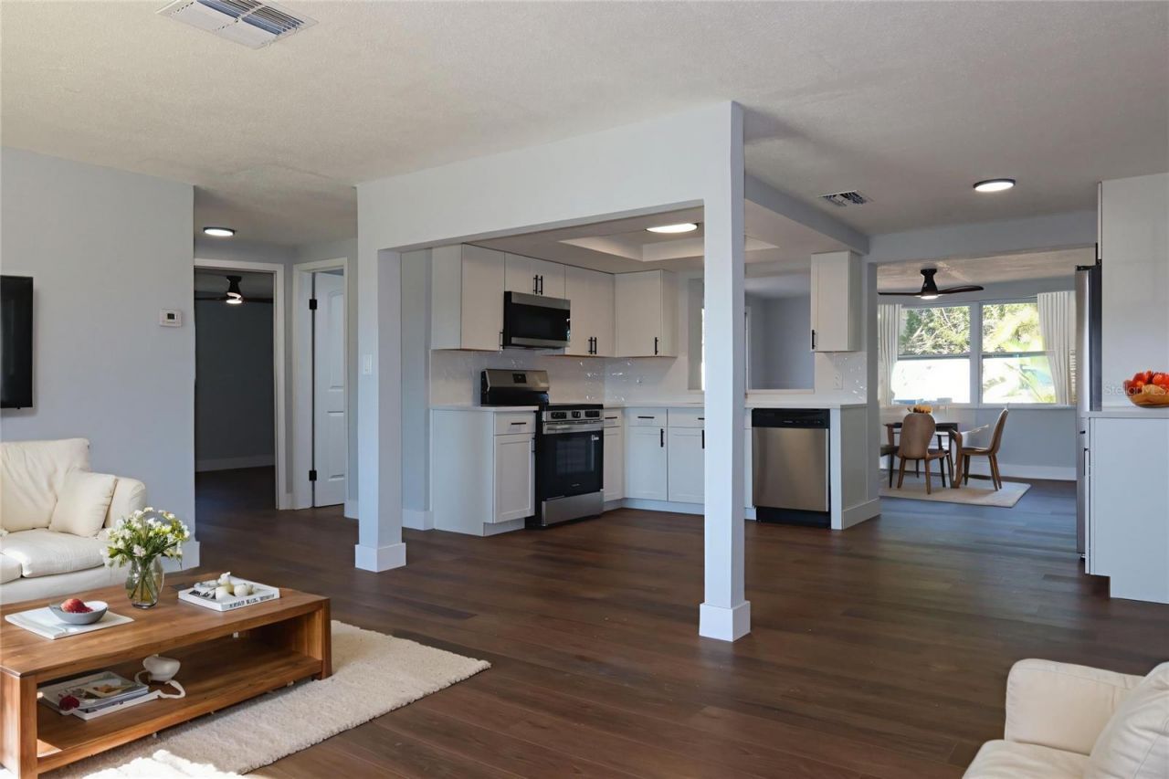 One or more photo(s) has been virtually staged. Move-in ready 2-bedroom, 1-bath home with a 1-car garage and an excellent layout!This beautifully updated property features a spacious open-concept living area seamlessly connected to the kitchen, creating a bright and inviting space ideal for everyday living and entertaining.The home has been freshly painted inside and out and offers luxury vinyl flooring throughout. The kitchen showcases quartz countertops, brand-new appliances, and new light fixtures that elevate the entire space.Major upgrades include a brand-new HVAC system, brand-new water heater, and a roof replaced in 2018, providing peace of mind for years to come.Step outside to an exceptionally large backyard, perfect for gatherings and outdoor enjoyment, complete with a fixed outdoor fireplace and a large storage shed.With its functional layout, quality upgrades, and move-in ready condition, this home is a fantastic opportunity for homeowners or investors alike.