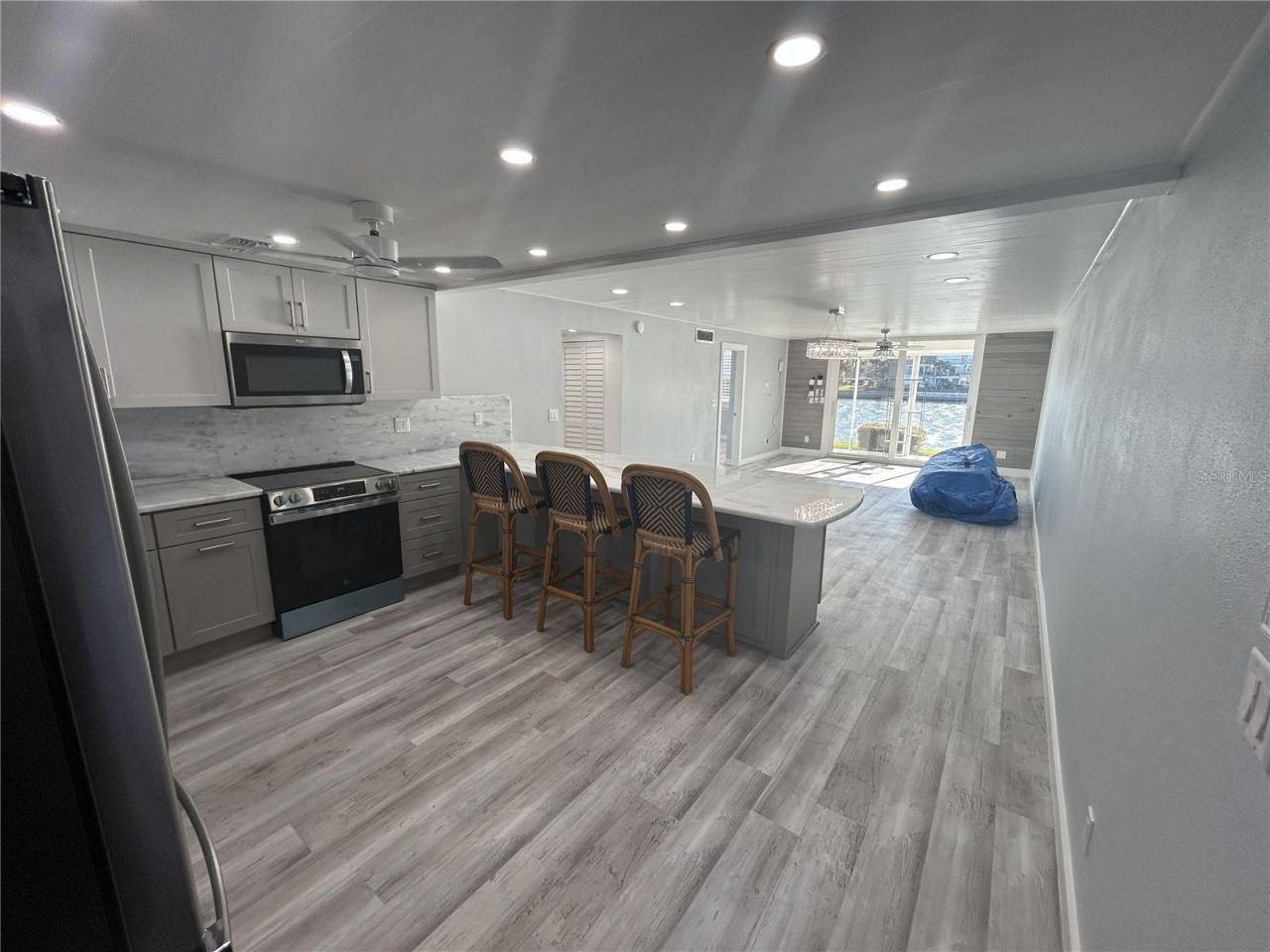 This is your chance to live in a completely update water front condo. It is a two bedroom two bath condo with a open concept, the kitchen is open to the large dinning, living room combination. This unit is completely updated with a retractable screen and storm shutters on the balcony right off the beautiful canal. All new appliances and it even has a wine/beverage fridge built in the the breakfast bar. Bay Island is one of the premier resort communities in the area. It is a gated community that has a his and hers gym, billiards room, ping pong room, car wash stations, tennis/pickleball courts, gas grills, several pools and spas. There is a very active social program at the club house if you choose to participate. Fire Place and stools do not stay.